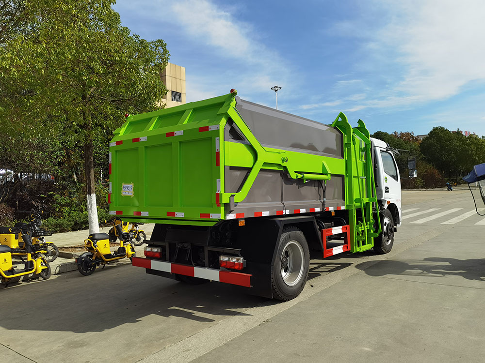 4、车厢平行举升,可与各种型号的压缩车对接,将车厢内垃圾平推**压缩车压缩机构内进行压缩。